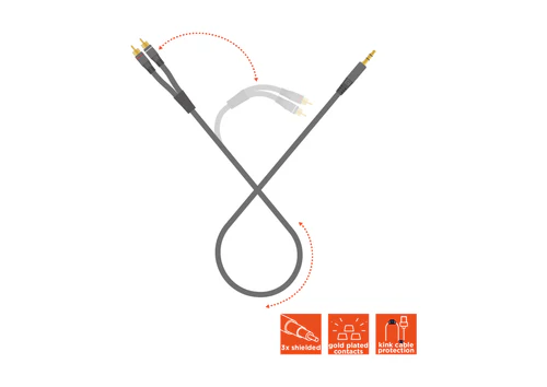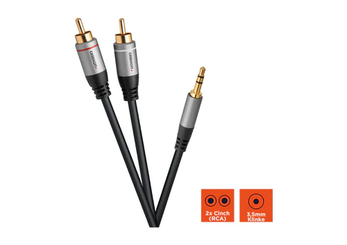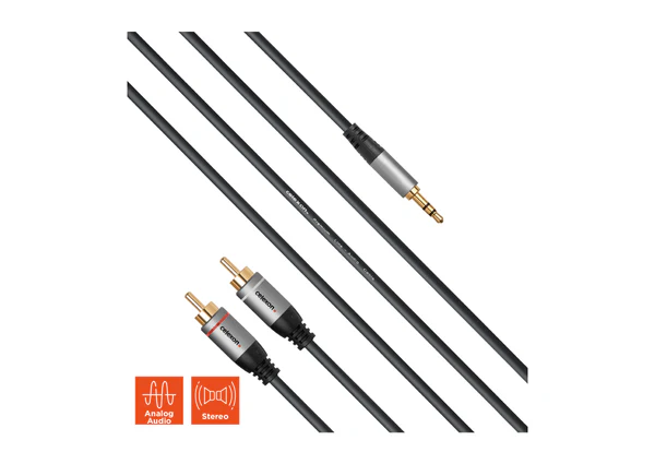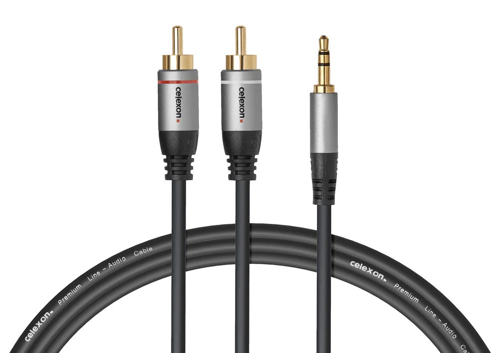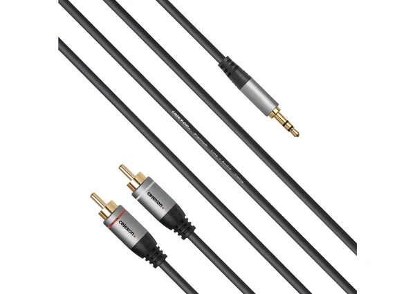 Le câble audio celexon 2x RCA vers jack stéréo 3,5 mm transmet les signaux audio en qualité stéréo et est donc idéal pour la connexion entre des appareils sources audio (par ex. smartphones, lecteurs MP3, ordinateurs portables, etc.) et des systèmes hi-fi ou home cinéma.