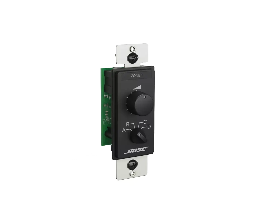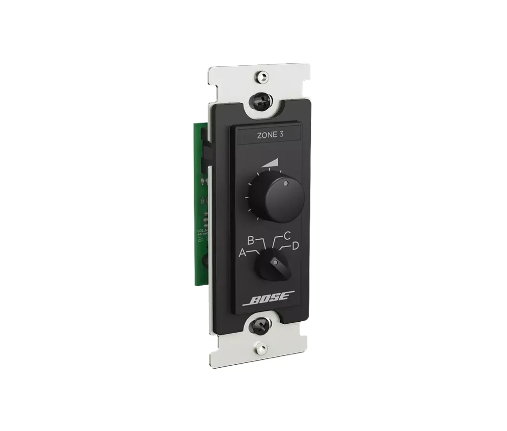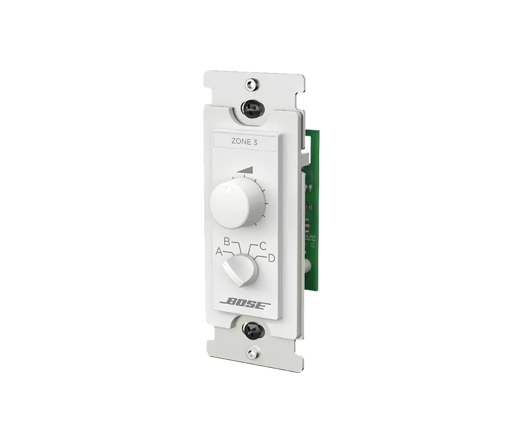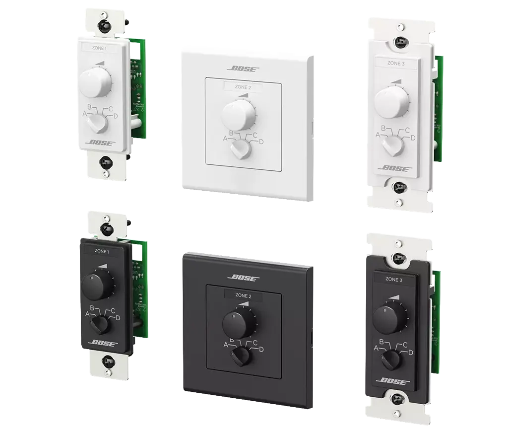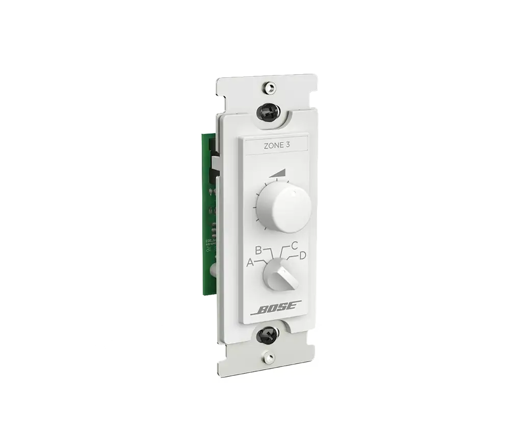 Les contrôleurs de zone Bose Professional ControlCenter CC-3 permettent de sélectionner le volume et la source A/B/C/D pour les produits ControlSpace. Trois modèles sont disponibles en noir ou en blanc et conviennent aux boîtiers électriques à un groupe en Amérique du Nord, en Europe et au Japon.