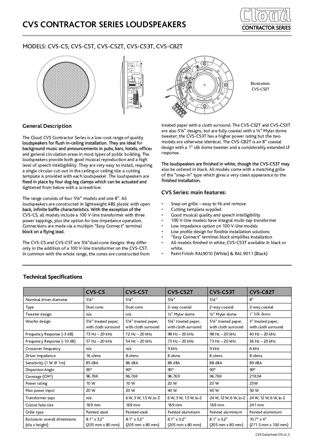 La série Cloud CVS Contractor est une gamme économique de haut-parleurs de qualité pour une installation encastrée au plafond. Idéal pour la musique de fond et les annonces dans les espaces publics et les bâtiments où une bonne reproduction musicale et une grande intelligibilité de la parole sont requises.