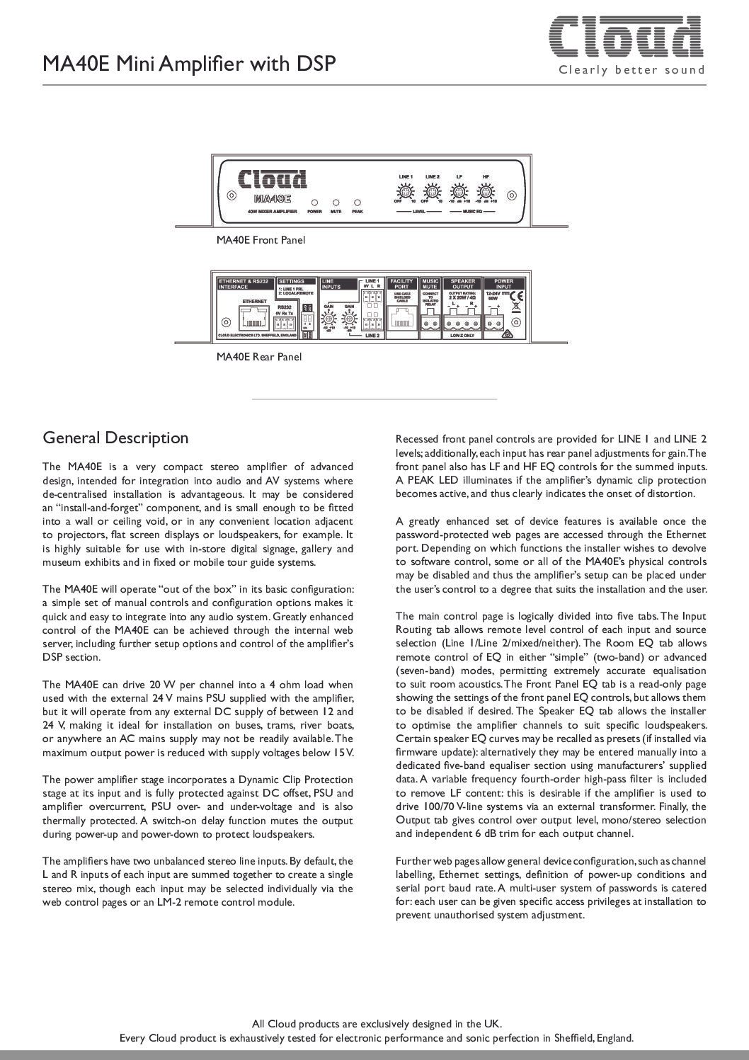 Le MA40E est un mini amplificateur fournissant 2 x 20 W de sortie stéréo à 4 Ω (faible impédance). Il est équipé d’une interface Ethernet et RS232, de deux entrées ligne et d’une option d’entrée de port d’installation permettant la connexion du module d’entrée mural LM-2 et du nouveau module d’entrée audio sans fil Bluetooth Cloud BT-1F.