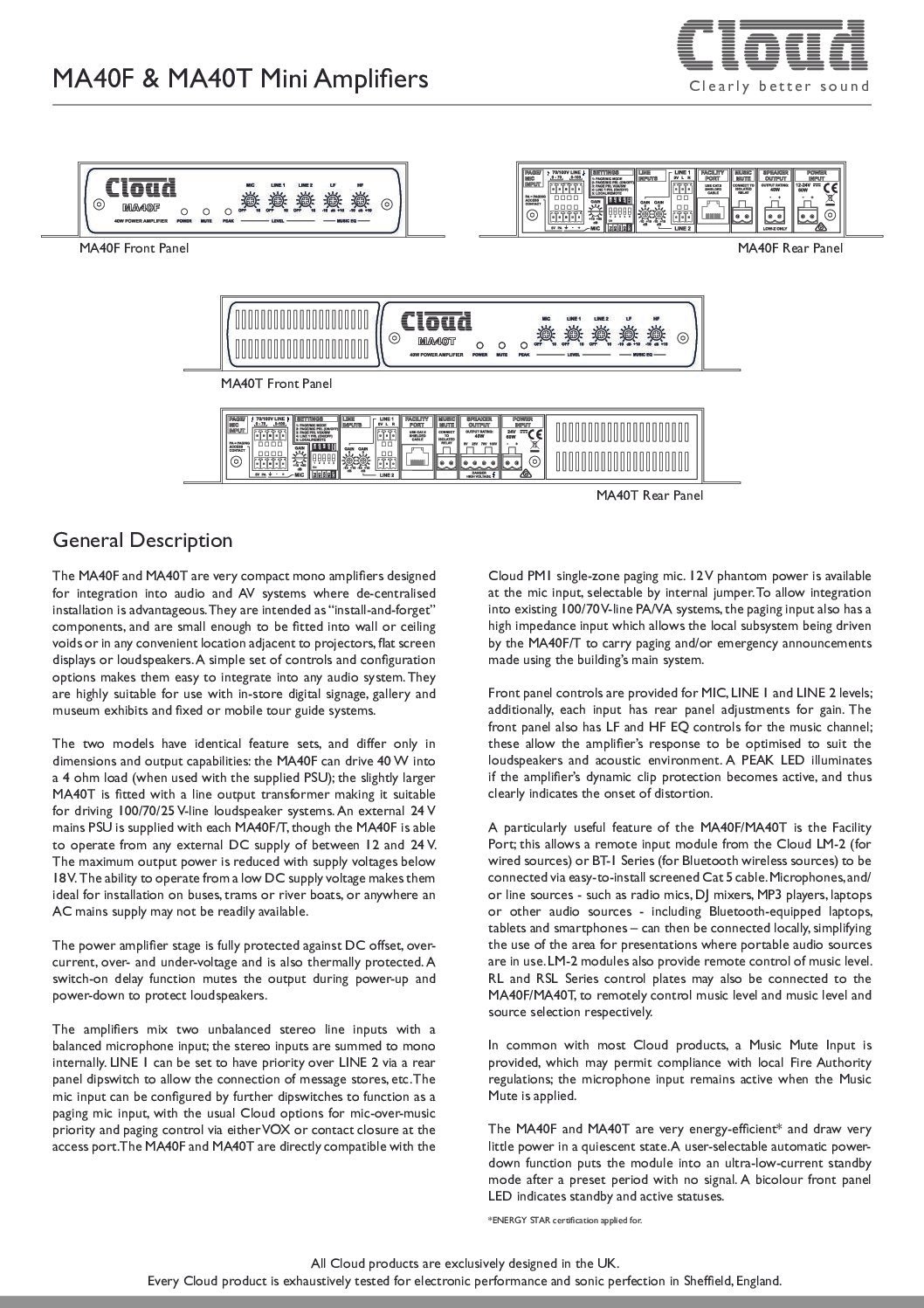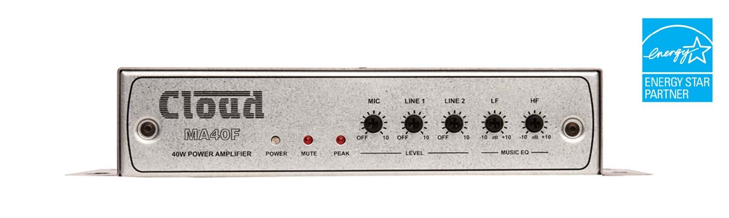 Le MA40F est un mini amplificateur fournissant une sortie mono de 40 W à 4 Ω (faible impédance). Il est équipé d’une entrée microphone d’appel avec contacts d’accès, d’une option d’entrée de ligne 70/100 V utile, de deux autres entrées de ligne et d’une option d’entrée de port d’installation permettant la connexion du module d’entrée mural LM-2 et du nouveau module d’entrée audio sans fil Bluetooth Cloud BT-1F.