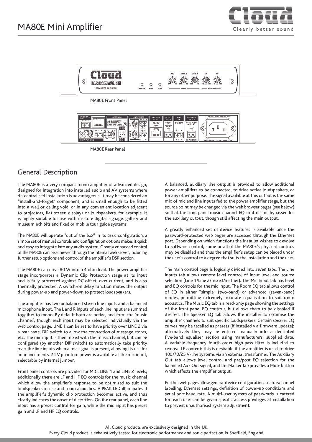 Le MA80E est un mini amplificateur fournissant une sortie mono de 80 W à 4 Ω (faible impédance). La différence notable entre la version « E » et le reste de la série MA80 est le navigateur Web Ethernet et l’interface de contrôle RS232. Il est équipé d’une entrée microphone de radiomessagerie avec contacts d’accès, de deux entrées de ligne et d’une entrée de port d’installation permettant la connexion des plaques murales du module d’entrée LM-2 et du module d’entrée sans fil audio Bluetooth BT-1F.