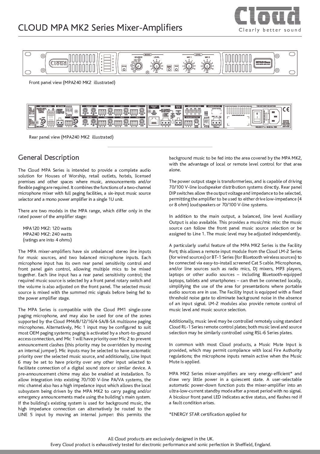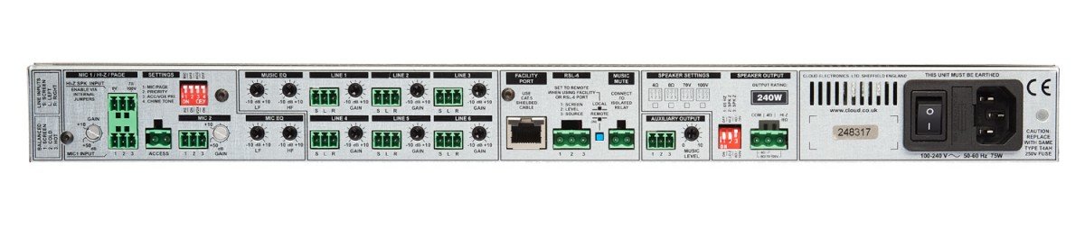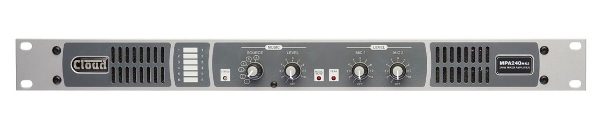 Le Cloud MPA240MK2 est un amplificateur mélangeur intégré de 240 W de classe mondiale qui offre une solution audio complète pour les lieux de culte, les points de vente, les hôtels, les locaux sous licence et autres espaces où la musique, les annonces et/ou la radiomessagerie flexible sont nécessaires. Il combine les fonctions d’un mélangeur de microphone à deux canaux avec des fonctions de radiomessagerie complètes, un sélecteur de source musicale à six entrées et un amplificateur de puissance mono dans une seule unité compacte 1U.